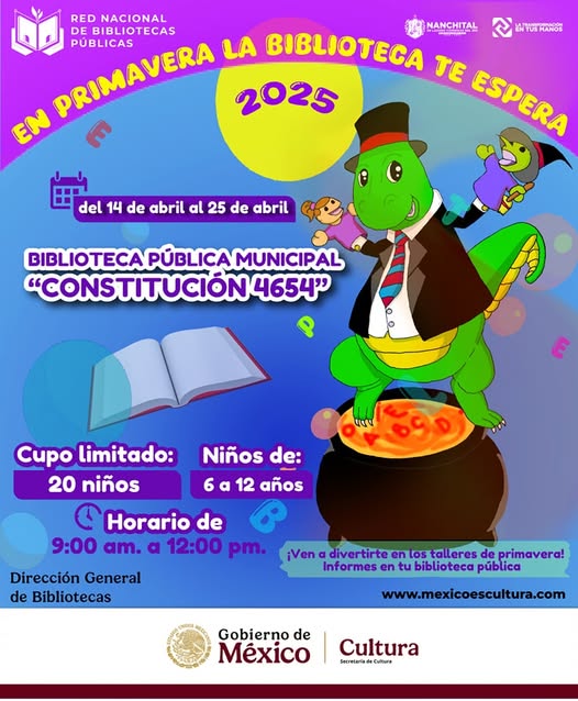 Puede ser una imagen de texto que dice "RED NACIONAL PUBLICAS LA 2025 EN PRIMAVERA DE BIBLIOTECAS NANCHITAL BNTUSMANOS TE ESPERA del 14 de abril al 25 de abril BIBLIOTECA PÚBLICA CAPÚBLICAMUNICIPAL MUNICIPAL "CONSTITUCIÓN 4654" पपप Cupo limitado: Niños de: 20 niños 6a12años 6 6a12 6 12 años Horaria Horario de 9:00 am. α 12:00 pm. Dirección General de Bibliotecas ¡Ven divertirte los talleres de primavera! Informes en tu biblioteca pública www.mexicoescultura.com Gobierno de México Cultura SecretariadeCutura eura"