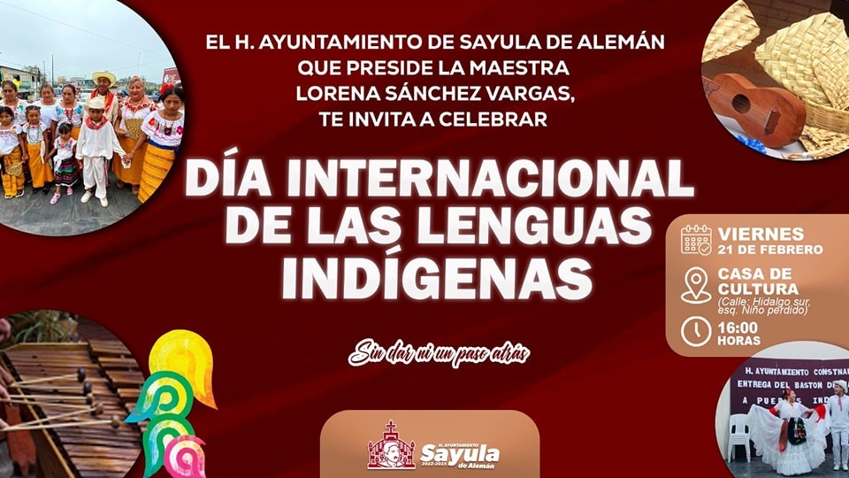 El H. Ayuntamiento que preside la Maestra Lorena Sánchez Vargas, hace la cordial invitación al público en general para asistir a la celebración del Dia Internacional de las Lenguas Indígenas, que se llevará a cabo el próximo viernes 21 de febrero a las 04:00 pm.