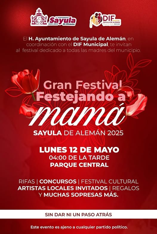 Puede ser una imagen de texto que dice "Sayula リ MAPUNTAMIENTO 2022-2025 eAleman DIF SAYULA ALEMAN №Aи E H. Ayuntamiento de Sayula de Alemán en ordinación cone el DIF Municipal, te invitan al festival dedicado a todas las madres del municipio. Gran Festiva! Festejando mamá SAYULA DE ALEMÁN 2025 LUNES 12 DE MAYO 04:00 DE LA TARDE PARQUE CENTRAL RIFAS CONCURSOS FESTIVAL CULTURAL ARTISTAS LOCALES INVITADOS REGALOS MUCHAS SOPRESAS MÁS. SIN DAR N UN PASO ATRÁS Este evento es ajeno a cualquier partido político."