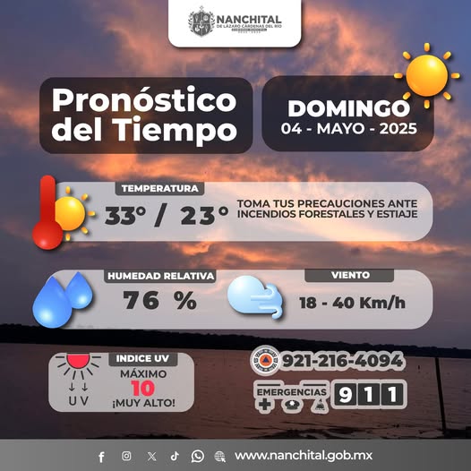 Puede ser una imagen de ‎texto que dice "‎NANCHITAL 보드.디로오요 GEE Pronóstico del Tiempo DOMINGO 04- MAYO -2025 TEMPERATURA 33°/ 23 TOMA TUS PRECAUCIONES. ANTE INCENDIOS FORESTALES ESTIAJE HUMEDADRELATIVA HUMEDAD RELATIVA 76% % 76 VIENTO 18 18-40Km/h 40 Km/h INDICE UV MÁXIMO 10 ¡MUYALTO! ¡MUY ALTO! UV 921-216-4094 EMERGENCIAS 911 1 1 ل uik www.nanchital.gob.mx‎"‎