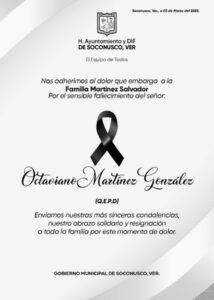 El Gobierno Municipal de Soconusco se une a la pena que embarga a la Familia Martínez Salvador por el sensible fallecimiento del Sr. Octaviano Martínez González (Q.E.P.D.) Nuestro abrazo solidario y resignación a toda su familia por este momento de dolor. Descanse en paz.