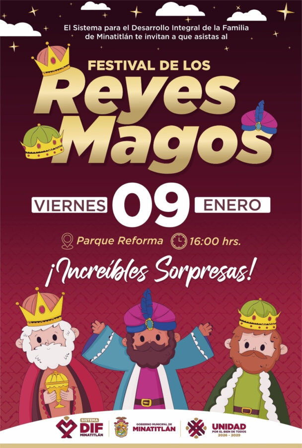 El Sistema DIF de Minatitlán invita a todas las niñas y niños del municipio para que asistan al «Festival de los Reyes Magos 2026». Ven con tus pequeños y disfruta de una tarde mágica y divertida.