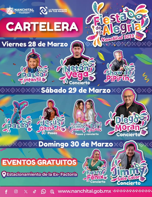Puede ser una imagen de 7 personas y texto que dice "NANCHITAL paAAuи . ELDA TANOS EN TUSMANOS TRANSFORNACIOH Viernes 28 de Marzo CARTELERA Flestec de Alegria 2025 NancAital yeAa Show Finfantil Concierto Pipiring Sábado 29 de Marzo ង្កំជេធីម្នាំ Jesús GamaJr a Paseo DJMeirer ాో్ణ Carvalho XUXUS Paseo concierto Diego Moran Concierto Domingo 30 de Marzo EVENTOS GRATUITOS Estacionamiento de la Ex- Factoría f Fanny Fenixs Jimm SaleCalor Sale Calor Concierto Concierto www.nanchital.gob.mx ঙঞঞঞঞঞঞ"