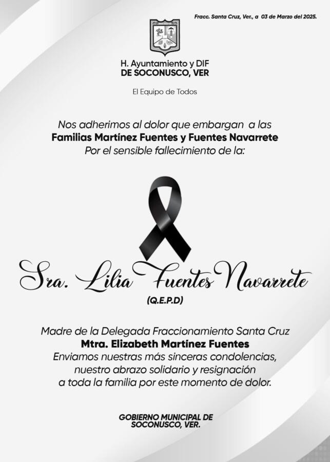 El Gobierno Municipal de Soconusco, Ver., envía sus condolencias a la Mtra. Elizabeth Martínez Fuentes Delegada del Fraccionamiento Santa Cruz, por el sensible fallecimiento de la Sra. Lilia Fuentes Navarrete, acaecida el día de hoy; rogándole al creador pronta resignación a sus familiares y amistades, . Descanse en paz.