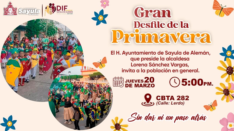 Puede ser una imagen de una o varias personas y texto que dice "Sayula deAleman deAleman DIF SAYULAD SAYULADEALEMAN ALEMAN KAPMИ Gran Desfile de la Primavera El H. Ayuntamiento de Sayula de Alemán, que preside la alcaldesa Lorena Sánchez Vargas, invita α la población en general. 0-0-0 JUEVES 20 :0 DE MARZO 5:00 PM. CBTA 282 (Calle: Lerdo) Sin dar ni un paso atrás"