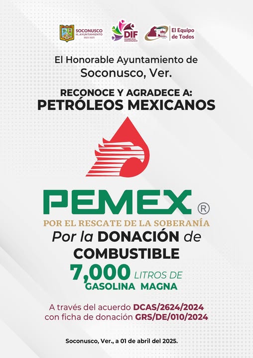 El H. Ayuntamiento de Soconusco, Veracruz que preside el Lic. Cuauhtémoc Baruch Custodio reconoce y agradece a Petróleos Mexicanos (PEMEX) por la donación de 7,000 litros de Gasolina Magna través del acuerdo DCAS/2624/2024 con ficha de donación GRS/DE/010/2024. El energético, será aplicado a diversos proyectos que implican el desarrollo y bienestar para la ciudadanía del municipio.