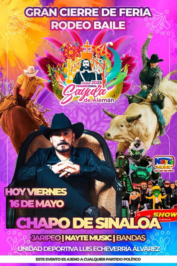 Te esperamos el día de hoy en el gran cierre de la Feria en Honor a San Isidro Labrador 2025, con un jaripeo baile contando con la presentación estelar del Chapo de Sinaloa, alternando con Nayte Music.