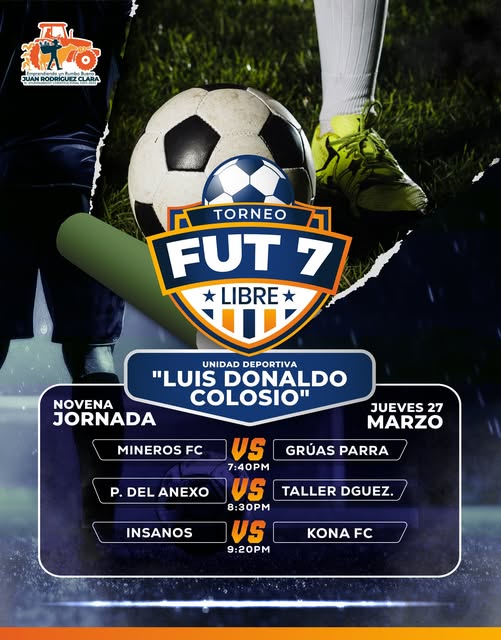 Puede ser una imagen de 1 persona, jugando al fútbol, jugando al fútbol y texto que dice "MIET ร ਪਤ Erprendenda danda da Rumba DUNTE KAMANNDENGUEZCLARA 広 TORNEO ለ FUT 7 LIBRE UNIDAD DEPORTIVA "LUIS DONALDO COLOSIO" NOVENA JORNADA MINEROS FC JUEVES 27 MARZO GRÚAS PARRA P. P.DELANEXO DEL ANEXO US 7:40PM US TALLER DGUEZ. 8:30PM US 9:20PM INSANOS KONAF FC"
