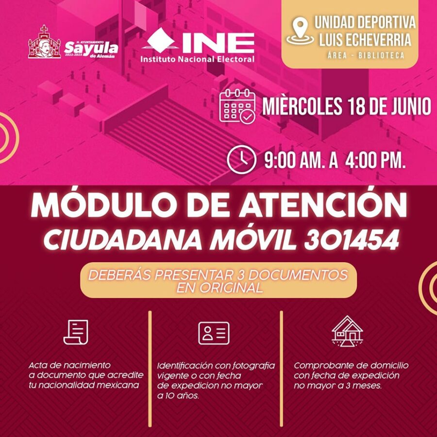 Con el apoyo del ayuntamiento que preside la maestra Lorena Sánchez Vargas, el Instituto Nacional Electoral (INE) del distrito XIV, con sede en Minatitlán, instalará en Sayula de Alemán, el módulo intinerante de atención ciudadana.