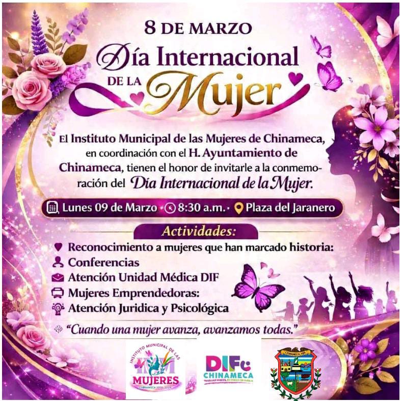 El H. Ayuntamiento de Chinameca Veracruz en coordinación con el Instituto Municipal de las mujeres. Te invitan a que juntas conmemoremos el «DIA INTERNACIONAL DE LA MUJER»