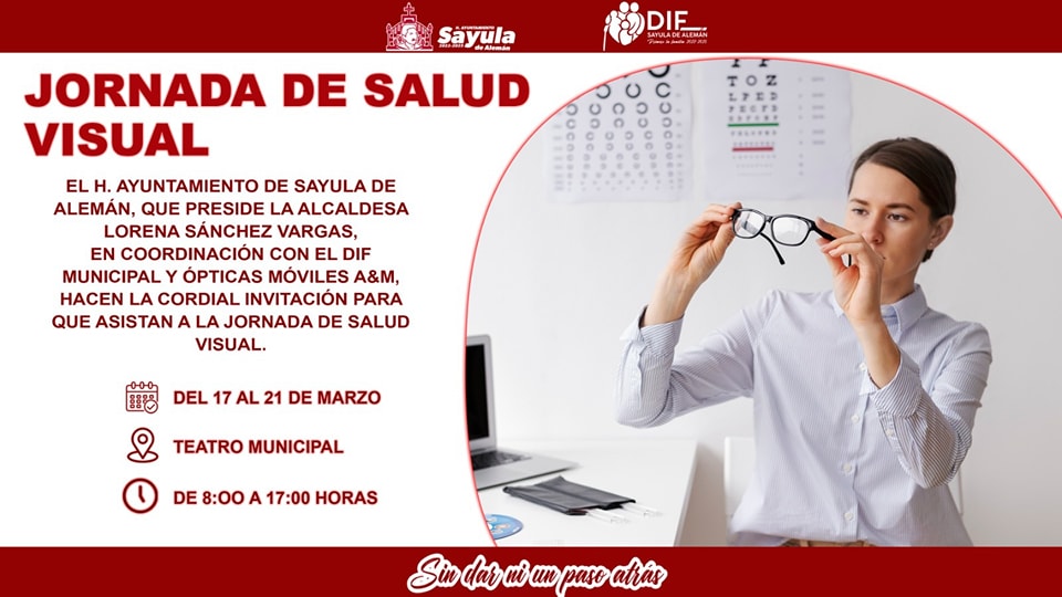 Puede ser una imagen de 1 persona, anteojos y texto que dice "Sayula DIF YULADE 二だ JORNADA DE SALUD VISUAL EL H. AYUNTAMIENTO DE SAYULA DE ALEMÁN, QUE PRESIDE LA ALCALDESA LORENA SÁNCHEZ VARGAS, EN COORDINACION CON EL DIF MUNICIPAL Y ÓPTICAS MÓVILES A&M, HACEN LA CORDIAL INVITACIÓN PARA QUE ASISTAN A LA JORNADA DE SALUD VISUAL. ዑ0ራ DEL 17 AL 21 DE MARZO TEATRO MUNICIPAL DE 8:00 A 17:00 HORAS Sivdatsuapasoahâs"