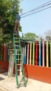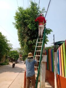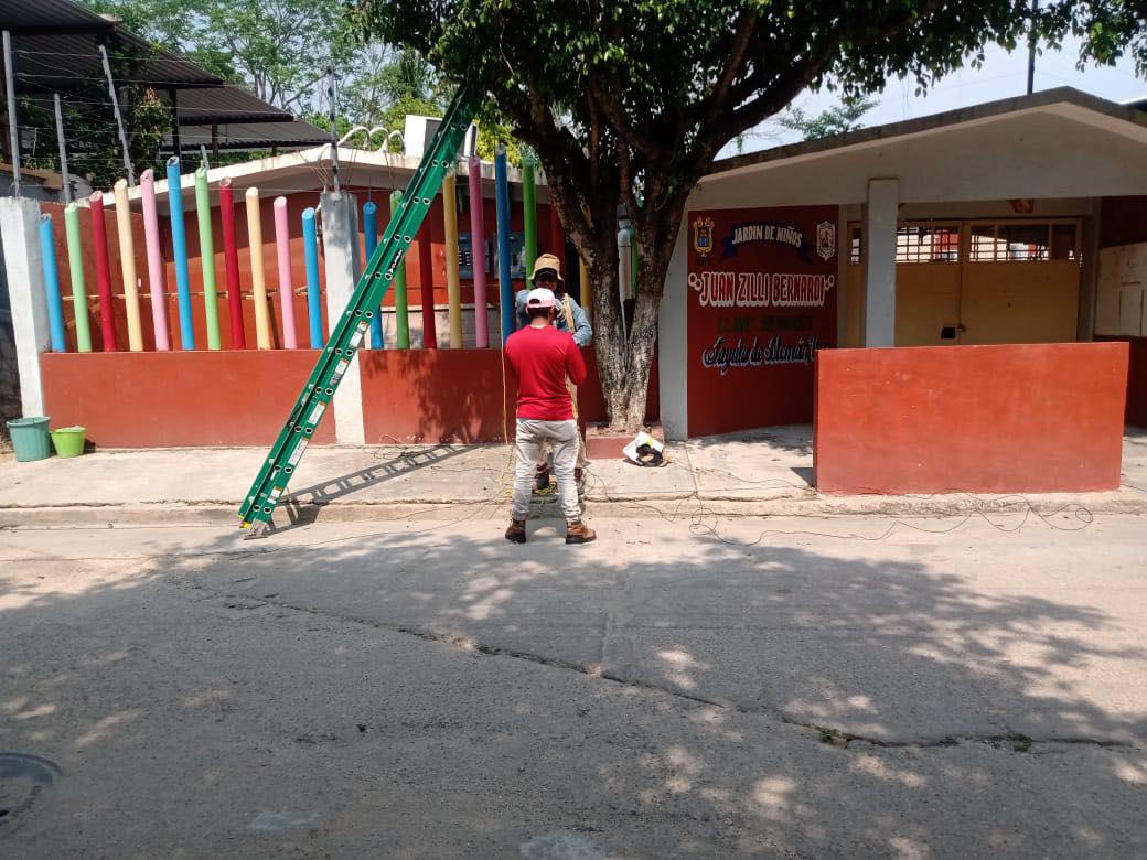 El equipo de alumbrado público realizan trabajos de instalación y rehabilitación de alumbrado público en tendido de cable y focos de led en la calle Veracruz, favoreciendo al jardín de niños Juan Zilli Bernardi.