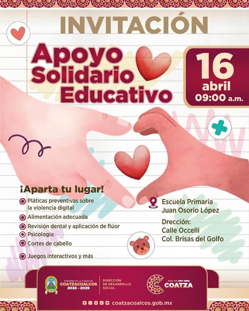 El próximo 16 de abril a las 09:00 a.m. en la Escuela Primaria Juan Osorio López, ubicada en la Calle Occelli, Col. Brisas del Golfo.