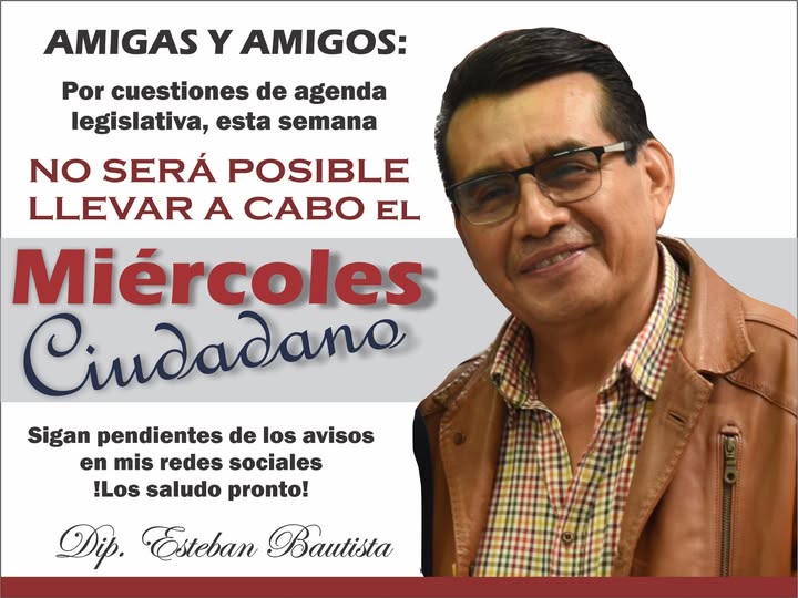 Puede ser una imagen de 1 persona y texto que dice "AMIGAS Y AMIGOS: Por cuestiones de agenda legislativa, esta semana NO SERÁ POSIBLE LLEVAR A CABO EL Miércoles CиAaAano Sigan pendientes de los avisos en mis redes sociales !Los saludo pronto! A.p. Esteban"