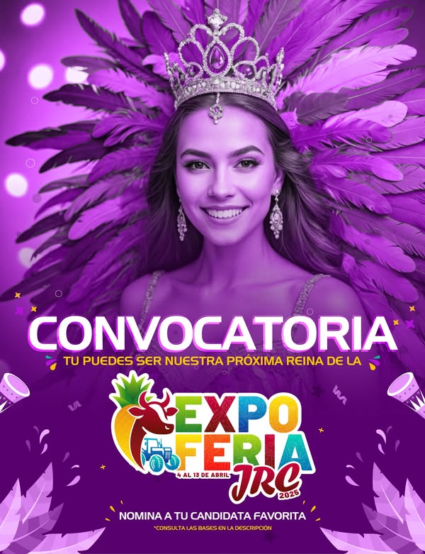 Puede ser una imagen de una persona y texto que dice "CONVOCATORIA TU PUEDES SER NUESTRA PRÓXIMA REINA DE IA EXPO FFERIA 4AL13DEA 4AL13DEABRIL DE EABRIL BRIL JRG 2025 NOMINA NOMINATUCANDIDATAFAVORITA A TU CANDIDATA FAVORITA *CONSULTAL CONSULTALASBASESENLADESCRPTDN LAS BASESE ENLADESCRIPCIÓN NU"