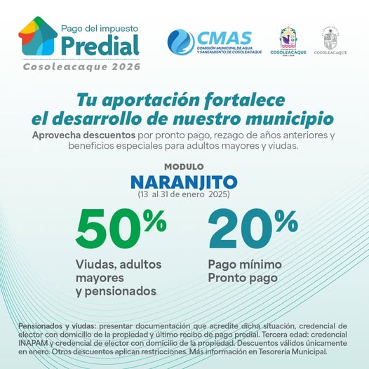 Aprovecha los descuentos por pronto pago, regulariza adeudos de años anteriores y accede a descuentos especiales para adultos mayores, pensionados y viudas.