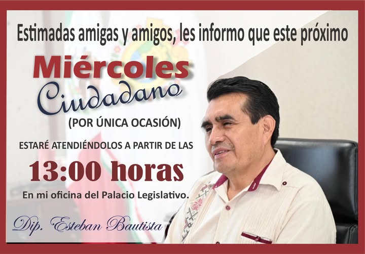 Por cuestiones de agenda y por única ocasión, este próximo miércoles 9 de abril, los estaré recibiendo con mucho gusto, A PARTIR DE LAS 13:00 HORAS, aquí en el Palacio Legislativo, en el Miércoles Ciudadano, para escucharlos y recibir sus peticiones, solicitudes y propuestas.