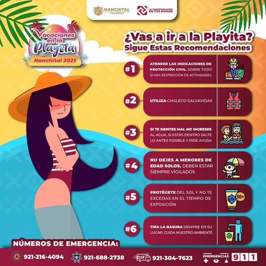 Puede ser una imagen de texto que dice "NANCHITAL ธมงานร acaciones Playcta enla Nanchital 2025 ¿VasairalaPlayita? Playita? Sigue Estas Recomendaciones #1 ATENDER LAS INDICACIONES DE PROTECCIÓN CIVIL, SOBRE ODO DEACTIVIDADES. # UTILIZA CHALECO SALVAVIDAS ートリー I-H-I #3 SIT SIENTES MAL AGUA.S ESTAS LO ANTES POSIBLE INGRESES SALTE PIDEAYUDA PIDE A MENORES DE EDAD SOLOS, ESTAR SIEMPRE VIGILADOS #5 PROTÉGETED SOL TE EXCEDAS NE EL TIEMPOD DE EXPOSICIÓN 50+ #6 NÚMEROS DE EMERGENCIA: TIRALABASURASIEMPREENSU ENSU TIRA LA BASURA LUGAR CUIDA NUESTRO IDANUESTROAMBIENTE AMBIENTE 921-216-4094 921-688-2738 DIFA 921-304-7623 EMERGENCIAS 911"