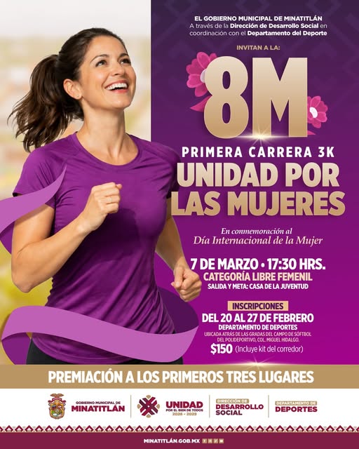 El Gobierno Municipal, que preside el maestro Guillermo Reyes Espronceda, te invita a la 1ra Carrera 3K «Unidad por las Mujeres» en conmemoración del #8M.