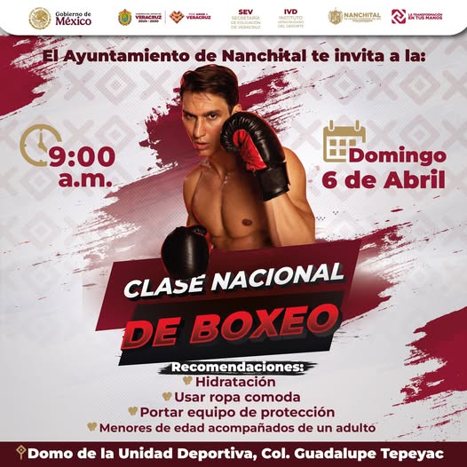 #Deportes | ¡PARTICIPA EN LA CLASE NACIONAL DE BOXEO! Domingo 6 de Abril 9:00 a.m. Unidad Deportiva de la colonia Guadalupe Tepeyac Conoce las recomendaciones aquí ¡Te esperamos! #LaTransformaciónEnTusManos #Nanchital #Comparte
