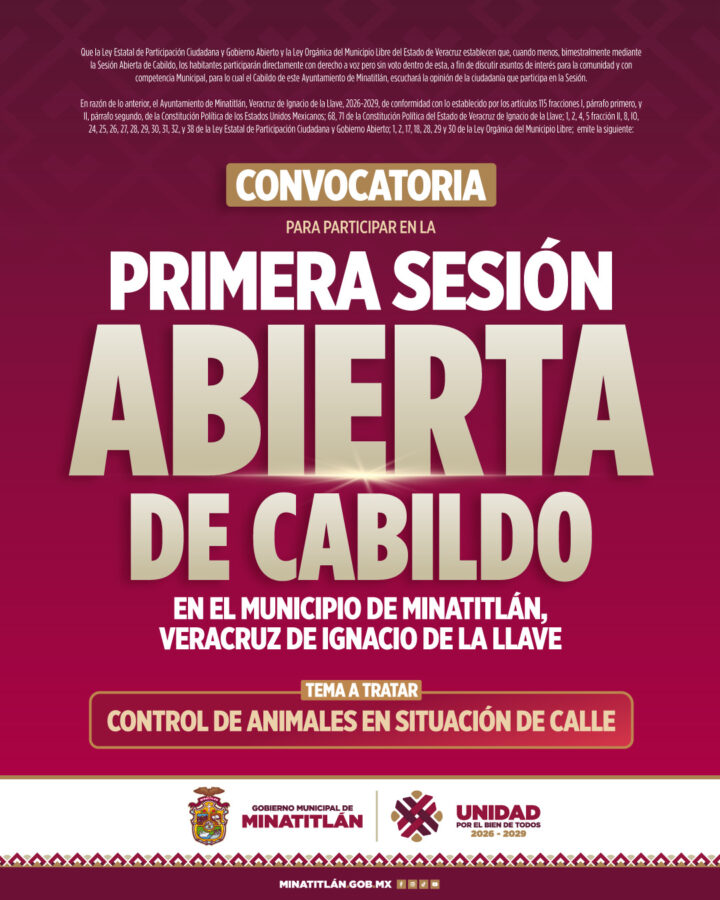 El H. Ayuntamiento de Minatitlán te invita a ser parte de la Primera Sesión Abierta de Cabildo, un espacio donde tu voz cuenta para construir mejores soluciones para nuestro municipio.