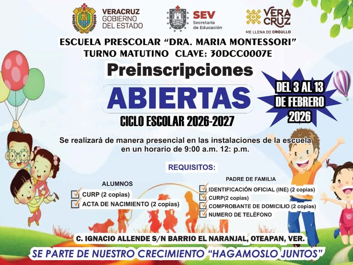Preinscripciones abiertas 2026, Escuela Preescolar Dra. María Montessori.