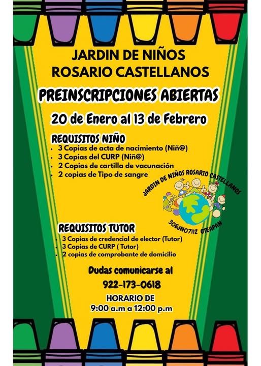 Preinscripciones abiertas 2026, Jardín de niños Rosario Castellanos.