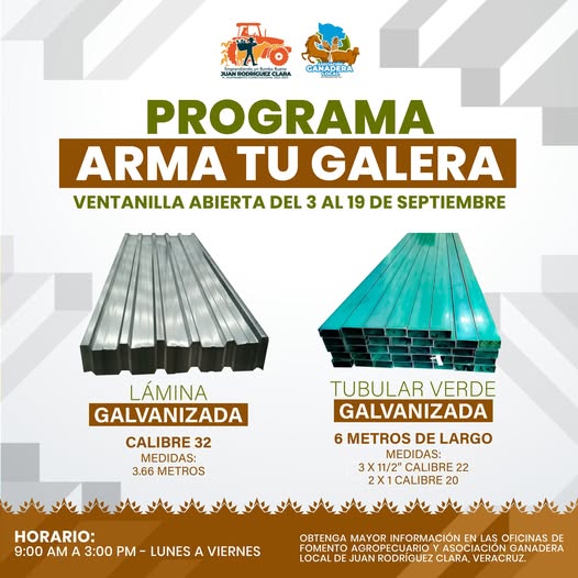 El H. Ayuntamiento Constitucional de Juan Rodríguez Clara en coordinación con la Asociación Ganadera Local Juan Rodríguez Clara te invitan a que adquieras los siguientes productos a precios subsidiados: Lámina Galvanizada y Tubular Verde Galvanizado.