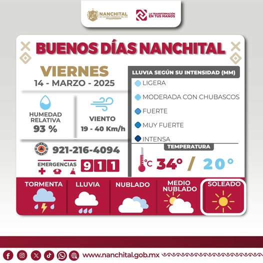Puede ser una imagen de texto que dice "ENANCHITAL 周 NANCHITAL ENTUSMANOS BUENOS DÍAS ÍASNANCHITAL VIERNES 14 MARZO 2025 LLUVIA SEGÚN SU INTENSIDAD (MM) LIGERA HUMEDAD RELATIVA 93 % MODERADA CON CHUBASCOS FUERTE VIENTO 19-40 19 Km/h MUY FUFRTE INTENSA TEMPERATURA 921-216-4094 EMERGENCIAS 1 TORMENTA LLUVIA 34° NUBLADO 20° MEDIO NUBLADO SOLEADO f www.nanchital.gob.mx ទសសសលឈបសសស"