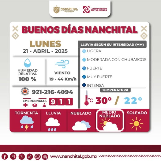 Puede ser una imagen de texto que dice "NANCHITAL ENTUSHANDS HANDS BUENOS DÍAS BUENOSDIASNANCHITAL NANCHITAL LUNES 21- ABRIL 2025 LLUVIA SEGÚN SU INTENSIDAD (MM) LIGERA HUMEDAD RELATIVA 100 100% % MODERADA CON CHUBASCOS FUERTE 19 VIENTO 44 Km/h MUY FUERTE EMERGENCIAS INTENSA TEMPERATURA 921-216-4094 911 TORMENTA LLUVIA 30° NUBLADO 22° MEDIO NUBLADO SOLEADO f 回 www.nanchital.gob.mx ७७७৩७९७७७९७७७७6७७."