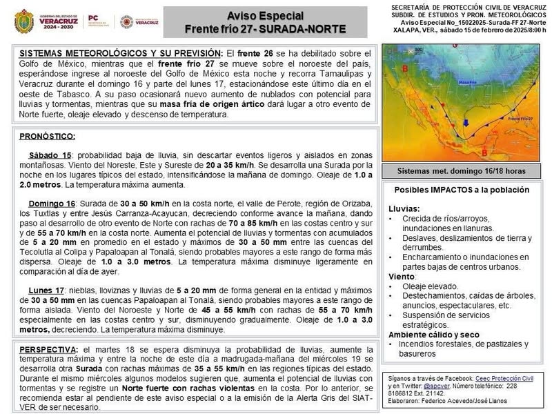 Domingo 16: Surada de 30 a 50 km/h en la costa norte, el valle de Perote, región de Orizaba, los Tuxtlas y entre Jesús Carranza-Acayucan, decreciendo conforme avance la mañana, dando paso al desarrollo de otro evento de Norte con rachas de 70 a 85 km/h en las costas centro y sur y de 55 a 70 km/h en la costa norte. Aumenta el potencial de lluvias y tormentas con acumulados de 5 a 20 mm en promedio en el estado y máximos de 30 a 50 mm entre las cuencas del Tecolutla al Colipa y Papaloapan al Tonalá, siendo probables mayores a este rango de forma más dispersa. Oleaje de 1.0 a 3.0 metros. La temperatura máxima disminuye ligeramente en comparación al día de ayer.