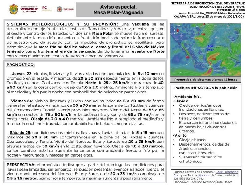 Viernes 24: nieblas, lloviznas y lluvias con acumulados de 5 a 20 mm de forma general en el estado y máximos de 50 a 70 mm en la zona de los Tuxtlas y cuencas del Coatzacoalcos-Tonalá, siendo probables mayores. Viento del Norte de 55 a 65 km/h con rachas de 75 a 90 km/h en la costa centro y sur, y de 65 a 75 km/h en la costa norte. Oleaje de 3.0 a 4.0 metros. Ambiente frío a templado al mediodía y frío por la noche-madrugada con probabilidad de heladas en partes altas.