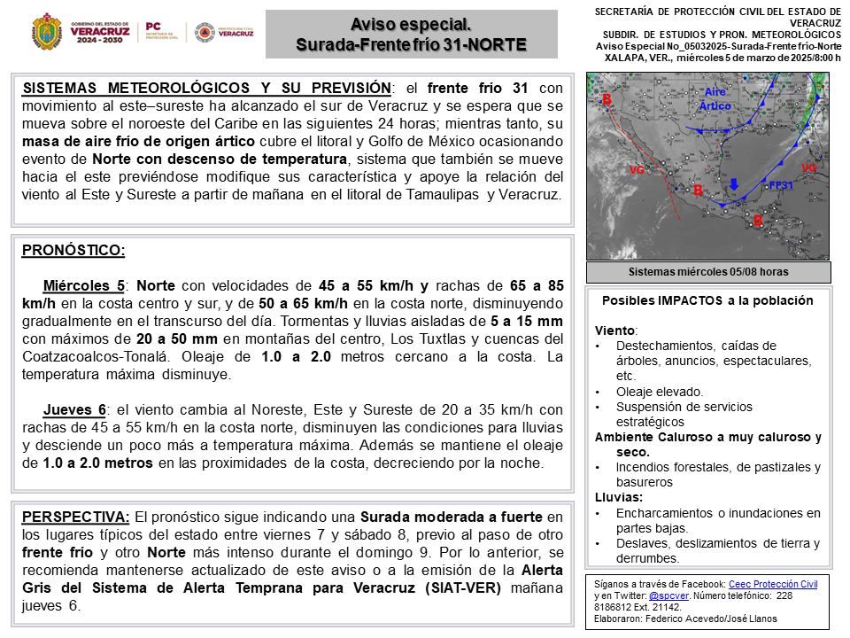 PERSPECTIVA: El pronóstico sigue indicando una Surada moderada a fuerte en los lugares típicos del estado entre viernes 7 y sábado 8, previo al paso de otro frente frío y otro Norte más intenso durante el domingo 9. Por lo anterior, se recomienda mantenerse actualizado de este aviso o a la emisión de la Alerta Gris del Sistema de Alerta Temprana para Veracruz (SIAT-VER) mañana jueves 6.Puede ser una imagen de mapa y texto