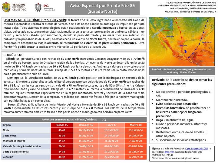 RESUMEN: el frente frío 35 está ingresando al noroeste del Golfo de México esperándose recorra el estado de Veracruz de esta noche a mañana domingo 16 impulsado por una masa polar. Tales sistemas meteorológicos están ocasionando una Surada moderada a fuerte en las zonas típicas del estado que, se prevé persista hasta mañana en la zona sur provocando un ambiente cálido a muy cálido y seco hoy sábado; posteriormente, debido al paso del frente y su masa fríos aumentarían los nublados y la probabilidad de lluvias, se establecería un evento de Norte fuerte, decreciendo por la noche, la temperatura descendería. Por lo anterior, se recomienda se extremen las precauciones pertinentes. Otro frente frío podría cruzar la entidad entre miércoles 19 por la tarde al jueves 20.