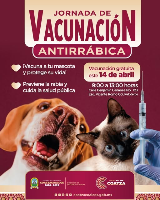 ¡Tu mascota también es parte de la familia! El Gobierno de Coatzacoalcos invita a todos los vecinos de la colonia Peloteros a la jornada de vacunación gratuita este próximo martes 14 de abril.