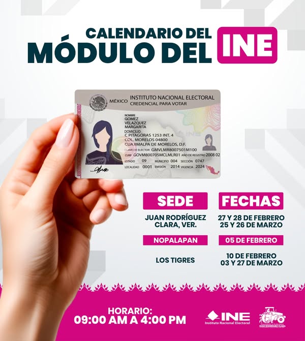 Puede ser una imagen de ‎texto que dice "‎CALENDARIO DEL MÓDULO DEL INE MÉXICO CREDENCIAL PARA VOTAR INSTITUTO NACIONAL ELECTORAL MOMBRE MORELOS0480 04800 JIMALPA MORELOS 0750110 CuTP GOVMB00705MCLMLR01 ARODERE FEGISTRO2008 02 0747 VIGENCIA 2024 上ゆ LOCALIDAD 0001 EMISION 2014 SEDE JUAN RODRÍGUEZ CLARA, VER. 27 FECHAS 28 DE FEBRERO 26 DE MARZO NOPALAPAN DE FEBRERO LOS TIGRES عاهو 10 DE EFEBRERO 03 27 DE MARZO y هر y HORARIO: 09:00 AM A 4:00 INE Instituto NacionalElecto Nacional Electora ๐ 주버시이클니프.주세요‎"‎
