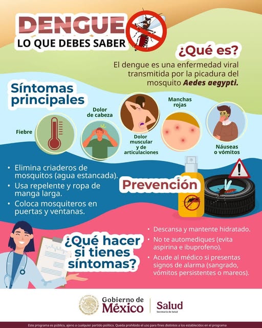 Puede ser una imagen de texto que dice "DENGUE LO QUE DEBES SABER ¿Qué es? El dengue es una enfermedad viral transmitida por la picadura del mosquito Aedes aegypti. Síntomas principales Dolor de cabeza Fiebre Manchas rojas Dolor muscular yde yde articulaciones Náuseas ၀ ovómitos Elimina criaderos de mosquitos (agua estancada). Prevención Usa repelente y ropa de manga larga •Coloca mosquiteros en puertas ventanas. ¿Qué hacer, si tienes síntomas? Descansa mantente hidratado. No te automediques (evita aspirina ibuprofeno). Acude al médico si presentas signos de alarma (sangrado, vómitos persistentes mareos) Gobierno de México Salud Secretariade SecrntariadeSarud Salud orghibido"