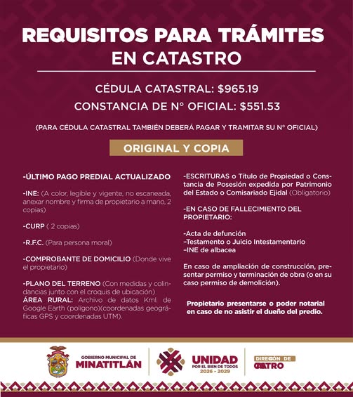 El Gobierno Municipal te informa sobre los costos y requisitos vigentes para obtener tu Cédula Catastral y Constancia de Número Oficial.