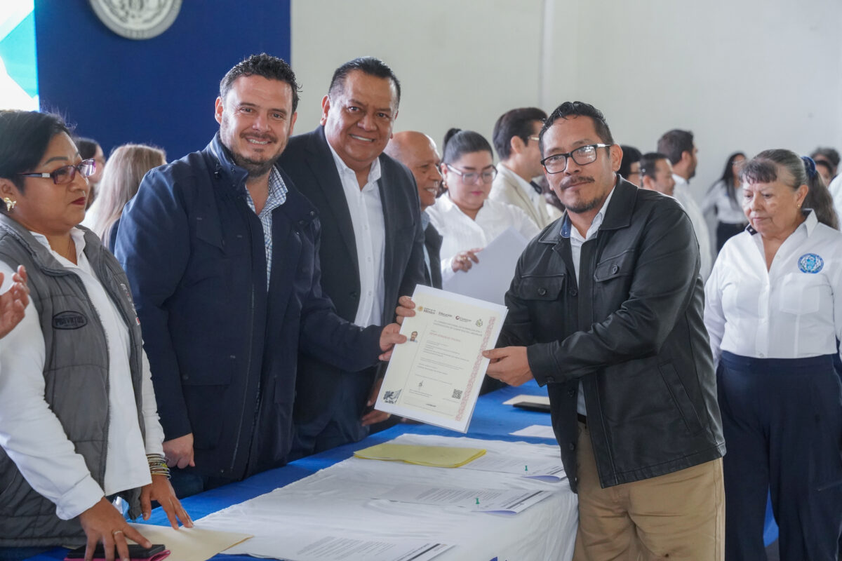Junto a las autoridades educativas, el alcalde participó en la entrega de reconocimientos a docentes que lograron la certificación del Estándar de Competencia EC0217.01, avalado por el Consejo Nacional de Normalización y Certificación de Competencias Laborales (CONOCER) presenciales y a los alumnos con mejores promedios del semestre anterior.
