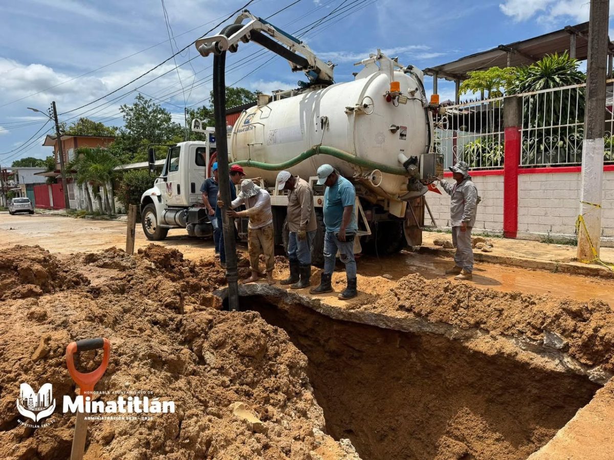 Minatitlán, Ver. – El Gobierno Municipal de Minatitlán, que preside la Dra. Carmen Medel Palma, a través de la Dirección General de Agua Potable y Alcantarillado (DGAPA), llevó a cabo la reparación de un tramo de 3 metros lineales de drenaje sanitario colapsado en la calle Niños Héroes, de la colonia Insurgentes Norte.