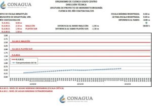 De acuerdo con el reporte más reciente emitido por la Comisión Nacional del Agua (CONAGUA), el monitoreo actual indica que no se prevé riesgo de desbordamiento, manteniéndose estable en 0.60 metros.
