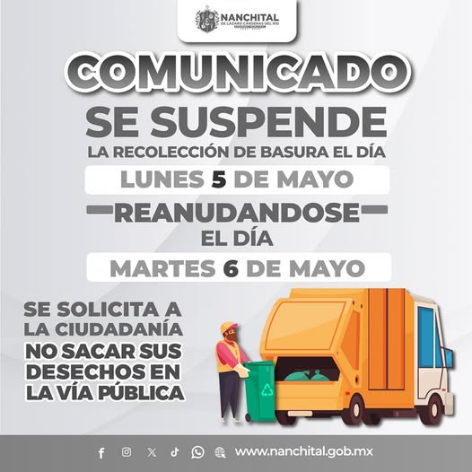 #Comunicado | Se informa a la ciudadanía que este 5 DE MAYO del presente año, NO HABRÁ SERVICIO de recolección de residuos sólidos urbanos.