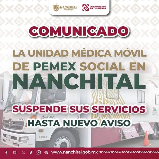 Se informa a la ciudadanía que, por motivo de MANTENIMIENTO, la Unidad Médica Móvil de PEMEX Social, SUSPENDE sus servicios hasta #NUEVOAVISO.