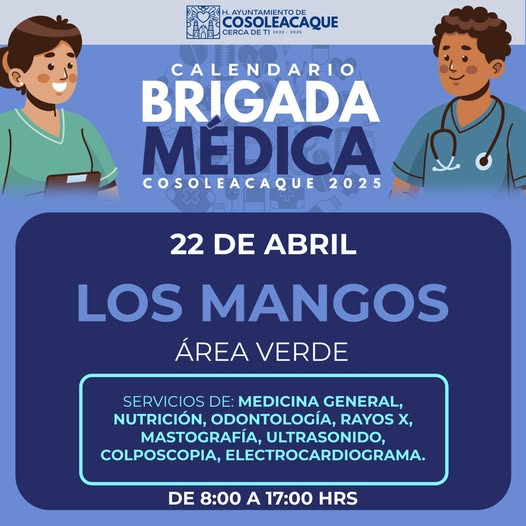 Puede ser una imagen de texto que dice "AYUNTAMIENTOD COSOLEACA COSOL CERCA DET FTI 3E2 3833 2328 CALENDARIO BRIGADA MEDICA COSOLEACAQUE 2025 22 DE ABRIL LOS MANGOS AREA VERDE SERVICIOS DE: MEDICINA GENERAL, NUTRICIÓN, ODONTOLOGÍA, RAYOS X, MASTOGRAFÍA, ULTRASONIDO, COLPOSCOPIA, ELECTROCARDIOGRAMA. DE 8:00 A 17:00 HRS"