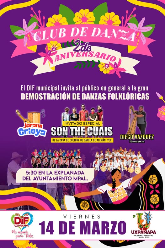 Silvia Flores Sánchez Presidenta del DIF Uxpanapa, en coordinación con el H. Ayuntamiento de Uxpanapa Veracruz 2022 – 2025 que encabeza Alonso Jaimes Ayala, invitan al publico en general a la gran Demostración de Danzas Folclóricas con motivo del Segundo Aniversario del Club de Danza del DIF Municipal.