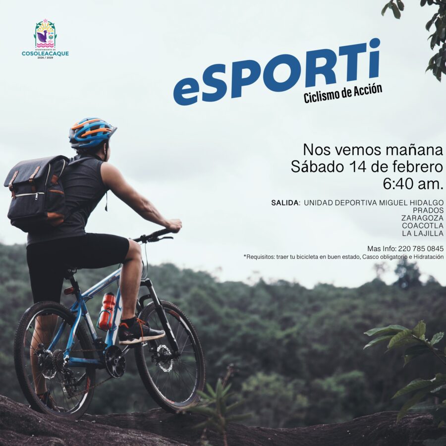 EL H. Ayuntamiento de Cosoleacaque, a través de la Comisión Municipal del Deporte te invita a participar en la rodada #eSPORTi, nivel principiante, que se llevará a cabo este sábado 14 de febrero en punto de las 6:40 de la mañana.