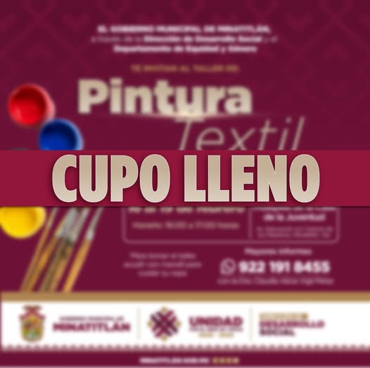 El Gobierno Municipal, a través de la Dirección de Desarrollo Social y el Departamento de Equidad y Género, informa que el taller de “Pintura Textil” a llegado a su limite de inscripción.