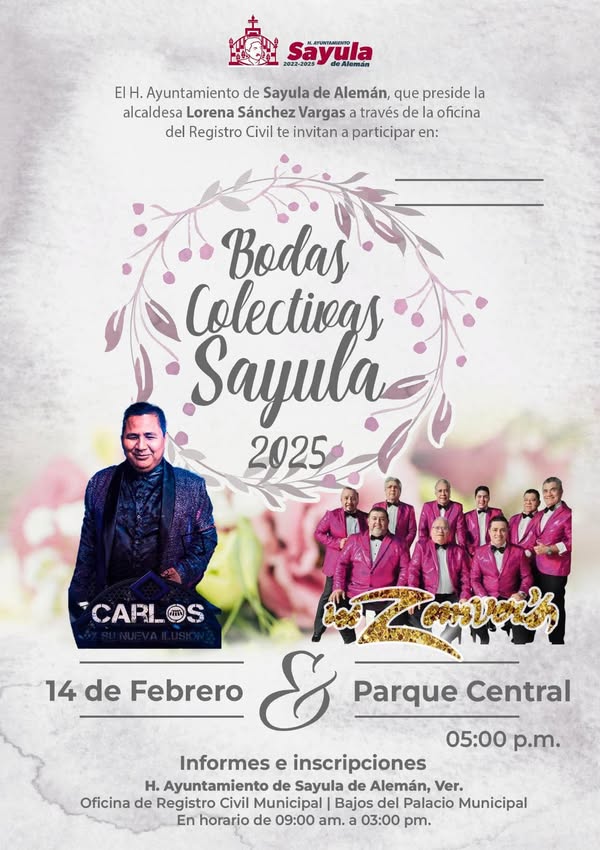 Gobierno Municipal de Sayula de Alemán, invita a todas las parejas que deseen unir sus vidas en matrimonio civil a participar en las Bodas Colectivas 2025, un evento que promueve el amor y el compromiso social.