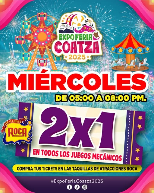 Puede ser una imagen de texto que dice "EXPOFERIA COATZA 2025* MIÉRCOLES DE 05:00 DE05:00A08:00PM A 08:00 PM. AIRACCIONES RACCIONES ROCA 2x1 EN TODOS LOS JUEGOS MECÁNICOS COMPRA TUS TICKETS EN LAS TAQUILLAS DE ATRACCIONESROCA #ExpoFeriaCoatza2025"