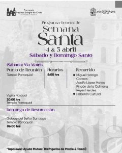 El Sábado Santo, a las 08:00 horas, se realizará el Vía Matris desde el templo parroquial, mientras que a las 20:00 horas tendrá lugar la Vigilia Pascual. Finalmente, el Domingo de Resurrección se celebrará el tradicional “Galope del Señor Santiago” a las 06:00 horas, cerrando con ello la Semana Mayor.